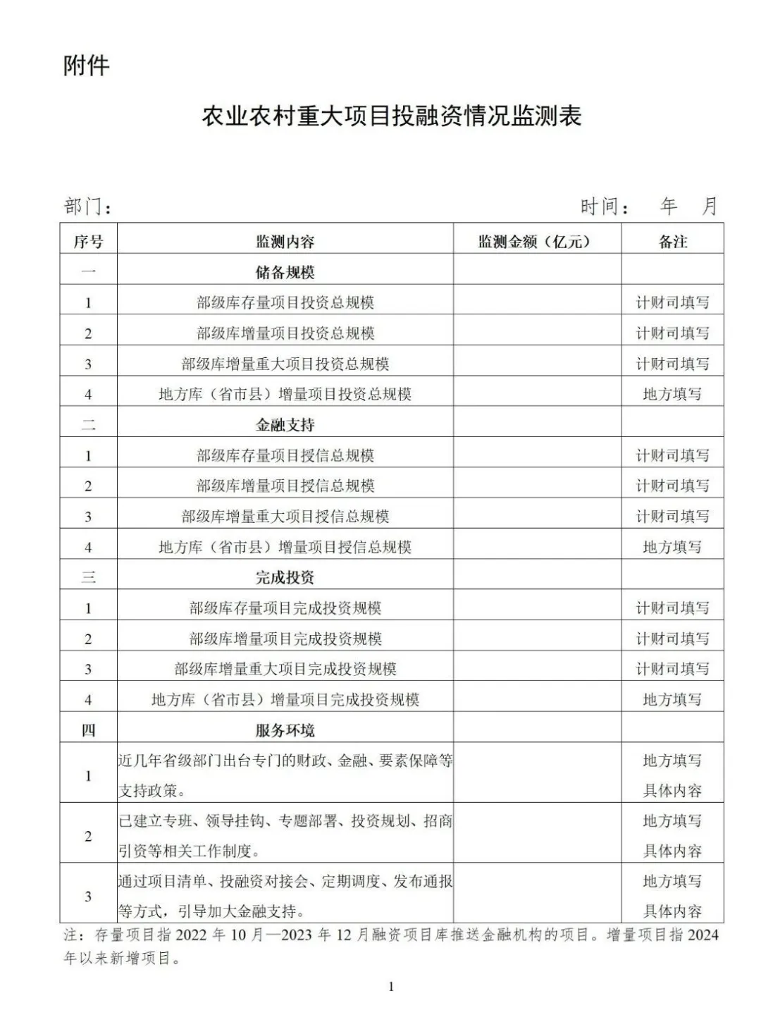 農(nóng)業(yè)農(nóng)村重大項(xiàng)目是國家實(shí)施鄉(xiāng)村振興戰(zhàn)略的重要支撐,是落實(shí)推進(jìn)鄉(xiāng)村全面振興、加快建設(shè)農(nóng)業(yè)強(qiáng)國的重要載體,也是推動(dòng)強(qiáng)化鄉(xiāng)村振興金融服務(wù)、加快補(bǔ)齊農(nóng)村金融服務(wù)短板的重要抓手。運(yùn)用好融資項(xiàng)目庫,全面深化農(nóng)業(yè)農(nóng)村重大項(xiàng)目融資對接服務(wù),有助于增強(qiáng)農(nóng)業(yè)農(nóng)村部門的金融思維,提升融資服務(wù)意識,有助于引導(dǎo)擴(kuò)大農(nóng)業(yè)農(nóng)村有效投資,促進(jìn)農(nóng)業(yè)農(nóng)村現(xiàn)代化重大工程落地,對完善鄉(xiāng)村振興多元化投入機(jī)制、發(fā)展農(nóng)業(yè)新質(zhì)生產(chǎn)力也具有重要的推動(dòng)作用。各地要高度重視這項(xiàng)工作,緊緊圍繞擴(kuò)大農(nóng)業(yè)農(nóng)村有效投資這個(gè)主要目標(biāo),聚焦高標(biāo)準(zhǔn)農(nóng)田、現(xiàn)代設(shè)施農(nóng)業(yè)、鄉(xiāng)村建設(shè)等農(nóng)業(yè)農(nóng)村基礎(chǔ)設(shè)施建設(shè)重點(diǎn)領(lǐng)域,會(huì)同銀行、投資基金、農(nóng)業(yè)投資公司等機(jī)構(gòu),統(tǒng)籌整合要素資源,完善打捆打包實(shí)施策略,創(chuàng)新市場化運(yùn)作機(jī)制,優(yōu)化科技賦能、央地協(xié)同、投融聯(lián)動(dòng)等工具手段,著力做好農(nóng)業(yè)農(nóng)村重大投融資項(xiàng)目謀劃儲(chǔ)備,暢通政銀企融資對接服務(wù)鏈條,引導(dǎo)撬動(dòng)金融和社會(huì)資本加大投入,有力有效推進(jìn)鄉(xiāng)村全面振興。二、分類分層充實(shí)項(xiàng)目儲(chǔ)備各級農(nóng)業(yè)農(nóng)村部門要按照分類設(shè)庫、分層儲(chǔ)備原則,建立健全相應(yīng)層級融資項(xiàng)目庫,制定或明確申報(bào)標(biāo)準(zhǔn),指導(dǎo)項(xiàng)目主體做好項(xiàng)目申報(bào)、入庫和逐級推薦等相關(guān)工作。(一)積極推動(dòng)享受國家信貸優(yōu)惠政策的項(xiàng)目納入儲(chǔ)備。對可以享受貸款貼息、再貸款等信貸優(yōu)惠政策的高標(biāo)準(zhǔn)農(nóng)田、現(xiàn)代設(shè)施農(nóng)業(yè)、技術(shù)改造和設(shè)備更新等領(lǐng)域項(xiàng)目,各地要準(zhǔn)確把握政策要求,積極推動(dòng)納入政策支持類項(xiàng)目庫。原則上,高標(biāo)準(zhǔn)農(nóng)田領(lǐng)域應(yīng)儲(chǔ)備符合《全國高標(biāo)準(zhǔn)農(nóng)田建設(shè)規(guī)劃(2021—2030年)》要求的高標(biāo)準(zhǔn)農(nóng)田建設(shè)項(xiàng)目?,F(xiàn)代設(shè)施農(nóng)業(yè)領(lǐng)域應(yīng)優(yōu)先儲(chǔ)備符合《全國推進(jìn)現(xiàn)代設(shè)施農(nóng)業(yè)建設(shè)規(guī)劃(2023—2030年)》要求的設(shè)施種植、設(shè)施畜牧、設(shè)施漁業(yè)、冷鏈物流、烘干設(shè)施等建設(shè)項(xiàng)目。技術(shù)改造和設(shè)備更新領(lǐng)域應(yīng)儲(chǔ)備符合技術(shù)改造再貸款、農(nóng)業(yè)機(jī)械分類行業(yè)標(biāo)準(zhǔn)等要求的屠宰廠(場)、水產(chǎn)養(yǎng)殖、農(nóng)產(chǎn)品初加工等領(lǐng)域設(shè)施設(shè)備淘汰更新項(xiàng)目,以及倉儲(chǔ)保鮮冷鏈物流、農(nóng)產(chǎn)品批發(fā)市場等現(xiàn)代物流領(lǐng)域項(xiàng)目。(二)大力推薦財(cái)政支持項(xiàng)目納入儲(chǔ)備。對已獲得超長期國債資金、中央預(yù)算內(nèi)投資資金、中央財(cái)政轉(zhuǎn)移支付資金等支持的項(xiàng)目,仍有融資需求的,各地要在符合有關(guān)政策規(guī)定的前提下做好梳理篩選,大力推薦納入財(cái)政支持類項(xiàng)目庫,引導(dǎo)通過撥投結(jié)合、投貸(融)聯(lián)動(dòng)等方式,更好助力新型農(nóng)業(yè)經(jīng)營主體、相關(guān)企業(yè)獲得融資,形成投資合力,高質(zhì)量完成項(xiàng)目建設(shè)。(三)有序引導(dǎo)社會(huì)投資項(xiàng)目納入儲(chǔ)備。對需要引入社會(huì)投資的現(xiàn)代設(shè)施農(nóng)業(yè)、種業(yè)振興、農(nóng)業(yè)農(nóng)村科技創(chuàng)新推廣、農(nóng)業(yè)綠色發(fā)展、農(nóng)產(chǎn)品加工和產(chǎn)業(yè)融合發(fā)展、智慧農(nóng)業(yè)等領(lǐng)域項(xiàng)目,各地要有序引導(dǎo)納入社會(huì)投資類項(xiàng)目庫,依法加強(qiáng)監(jiān)管,推動(dòng)農(nóng)業(yè)農(nóng)村領(lǐng)域社會(huì)投資規(guī)范健康發(fā)展。三、加強(qiáng)與金融機(jī)構(gòu)溝通對接各級農(nóng)業(yè)農(nóng)村部門要建立分層分級的融資對接服務(wù)機(jī)制,搭建權(quán)威、精準(zhǔn)、高效的政銀企交流平臺,通過投融資項(xiàng)目清單、對接活動(dòng)等方式引導(dǎo)撬動(dòng)信貸資金加大投入。(一)分級做好重大項(xiàng)目對接。各級農(nóng)業(yè)農(nóng)村部門應(yīng)綜合考慮項(xiàng)目單體投資規(guī)模、融資需求等因素,合理確定相應(yīng)層級項(xiàng)目庫入庫標(biāo)準(zhǔn),篩選形成備選項(xiàng)目清單推送相關(guān)金融機(jī)構(gòu)。其中,申請享受國家信貸優(yōu)惠政策的項(xiàng)目,以及投資規(guī)模超過5000萬元且融資需求1000萬元以上的財(cái)政支持項(xiàng)目和社會(huì)投資項(xiàng)目可推薦到部級庫,我部將篩選形成備選項(xiàng)目清單,推送21家全國性金融機(jī)構(gòu)。備選項(xiàng)目清單中,各級農(nóng)業(yè)農(nóng)村部門可將對