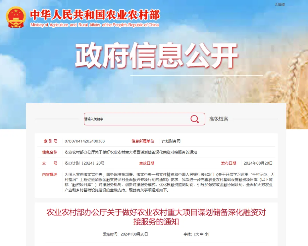 農(nóng)業(yè)農(nóng)村部辦公廳關(guān)于做好農(nóng)業(yè)農(nóng)村重大項(xiàng)目謀劃儲(chǔ)備深化融資對接服務(wù)的通知為深入貫徹落實(shí)黨中央、國務(wù)院決策部署,落實(shí)中央一號文件精神和中國人民銀行等5部門《關(guān)于開展學(xué)習(xí)運(yùn)用“千村示范、萬村整治”工程經(jīng)驗(yàn)加強(qiáng)金融支持鄉(xiāng)村全面振興專項(xiàng)行動(dòng)的通知》要求,我部進(jìn)一步完善農(nóng)業(yè)農(nóng)村基礎(chǔ)設(shè)施融資項(xiàng)目庫(以下簡稱“融資項(xiàng)目庫”)對接服務(wù)機(jī)制,創(chuàng)新對接服務(wù)模式,優(yōu)化投融資監(jiān)測功能,引導(dǎo)加強(qiáng)財(cái)政金融協(xié)同聯(lián)動(dòng),全面加大對農(nóng)業(yè)產(chǎn)業(yè)和鄉(xiāng)村基礎(chǔ)設(shè)施建設(shè)的金融支持。現(xiàn)就有關(guān)事項(xiàng)通知如下。