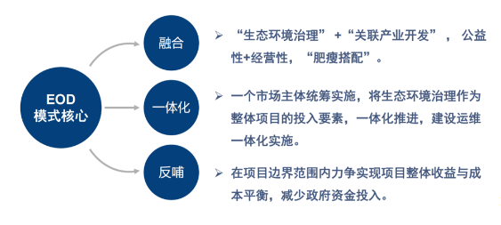 生態(tài)價值化EOD模式是“綠水青山就是金山銀山”理念在項(xiàng)目運(yùn)作中的應(yīng)用,可推動生態(tài)環(huán)境治理與關(guān)聯(lián)產(chǎn)業(yè)融合,實(shí)現(xiàn)生態(tài)價值轉(zhuǎn)化,提升生態(tài)環(huán)境治理項(xiàng)目造血功能,降低政府投資。