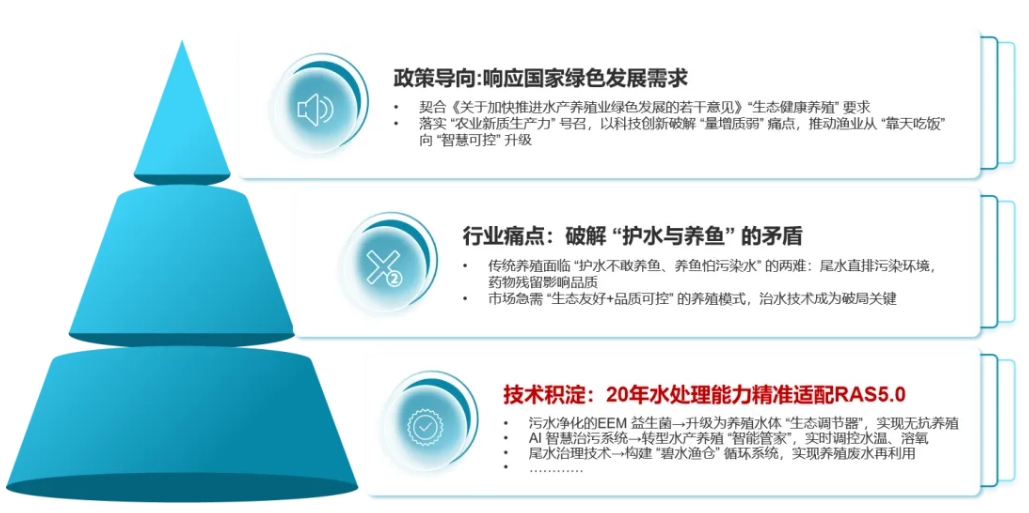 從治水到養(yǎng)魚,商達(dá)公用的轉(zhuǎn)型發(fā)展是基于政策、行業(yè)、技術(shù)三重驅(qū)動(dòng),不是跨界跟風(fēng),而是優(yōu)勢延伸。20 年水處理技術(shù)為商達(dá)公用發(fā)展智慧漁業(yè)提供了深厚的技術(shù)積淀:污水凈化的EEM 益生菌可升級為養(yǎng)殖水體“生態(tài)調(diào)節(jié)器”,實(shí)現(xiàn)無抗養(yǎng)殖;AI 智慧治污系統(tǒng)可轉(zhuǎn)型水產(chǎn)養(yǎng)殖“智能管家”,實(shí)時(shí)調(diào)控水溫、溶氧;尾水治理技術(shù)可構(gòu)建“碧水漁倉” 循環(huán)系統(tǒng),實(shí)現(xiàn)養(yǎng)殖廢水再利用。通過“好水養(yǎng)好魚”,實(shí)現(xiàn)水生態(tài)價(jià)值化,推進(jìn)從生態(tài)治理向生態(tài)價(jià)值化的產(chǎn)業(yè)升級戰(zhàn)略。