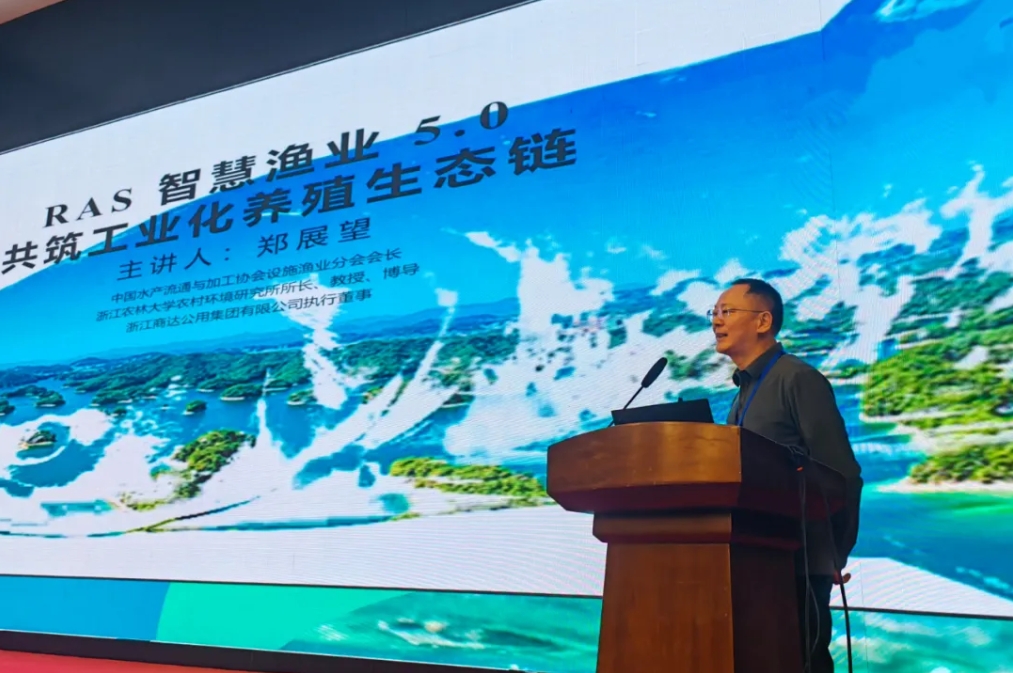 中國水產(chǎn)流通與加工協(xié)會(huì)設(shè)施漁業(yè)分會(huì)會(huì)長、浙江商達(dá)公用集團(tuán)有限公司執(zhí)行董事鄭展望教授受邀出席,作為主講嘉賓分享了《RAS智慧漁業(yè)5.0:共筑工業(yè)化養(yǎng)殖生態(tài)鏈》的創(chuàng)新實(shí)踐成果,為全球水產(chǎn)養(yǎng)殖轉(zhuǎn)型升級提供商達(dá)公用方案。