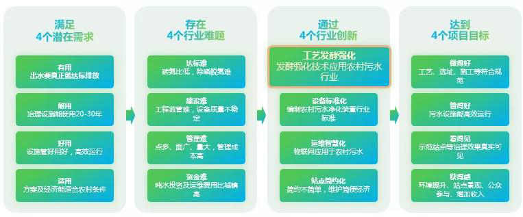 農(nóng)村污水治理4.0農(nóng)村污水治理4.0是一個(gè)系統(tǒng),其內(nèi)涵概況起來,主要包含了4個(gè)“4”,分別為滿足4個(gè)潛在需求、存在4個(gè)行業(yè)難題、通過4個(gè)行業(yè)創(chuàng)新、達(dá)到4個(gè)項(xiàng)目目標(biāo),最終要達(dá)到的是提升村民獲得感,也是農(nóng)村人居環(huán)境建設(shè)的出發(fā)點(diǎn)和落腳點(diǎn)。