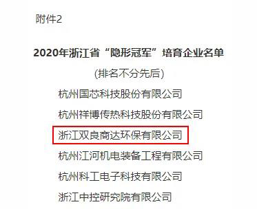 1月14日,浙江省經(jīng)濟(jì)和信息化廳官方公示發(fā)布《關(guān)于公布2020年浙江省“隱形冠軍”企業(yè)名單的通知》,公布了2020年浙江省“隱形冠軍”培育企業(yè)名單,浙江雙良商達(dá)環(huán)保有限公司入選“隱形冠軍”培育企業(yè)。同時(shí)入選的還有浙江中控研究院有限公司、杭州國(guó)芯科技股份有限公司、杭州科工電子科技有限公司等企業(yè)。