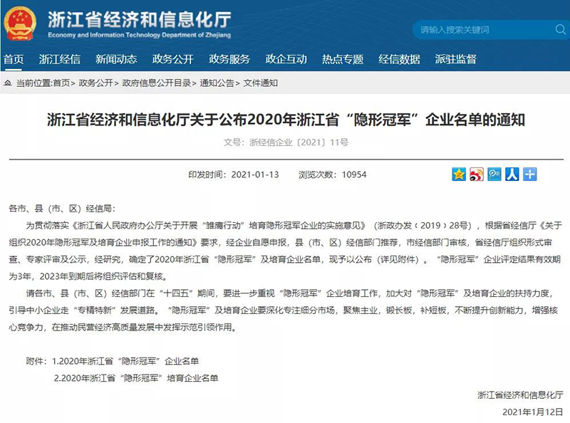 浙江省“隱形冠軍”企業(yè)是由浙江省人民政府辦公廳組織開展的一項評選活動,從產(chǎn)品市場占有率、產(chǎn)品創(chuàng)新性、生產(chǎn)技術(shù)水平、企業(yè)持續(xù)創(chuàng)新能力等方面打分,對企業(yè)有著嚴格要求。主要產(chǎn)品在行業(yè)內(nèi)具有優(yōu)良信譽,且市場占有率位于全國前5位或全省前3位;企業(yè)研發(fā)經(jīng)費支出占營業(yè)收入的比重不低于3%;相關(guān)關(guān)鍵性能指標處于國際同類產(chǎn)品的領(lǐng)先水平。