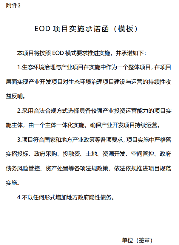 (四)EOD項(xiàng)目應(yīng)一并提交EOD項(xiàng)目實(shí)施方案(編制大綱見附件2)與承諾函(模板見附件3)。承諾函由項(xiàng)目申報(bào)主體和實(shí)施主體(市級及以下人民政府或園區(qū)管委會)蓋章。
