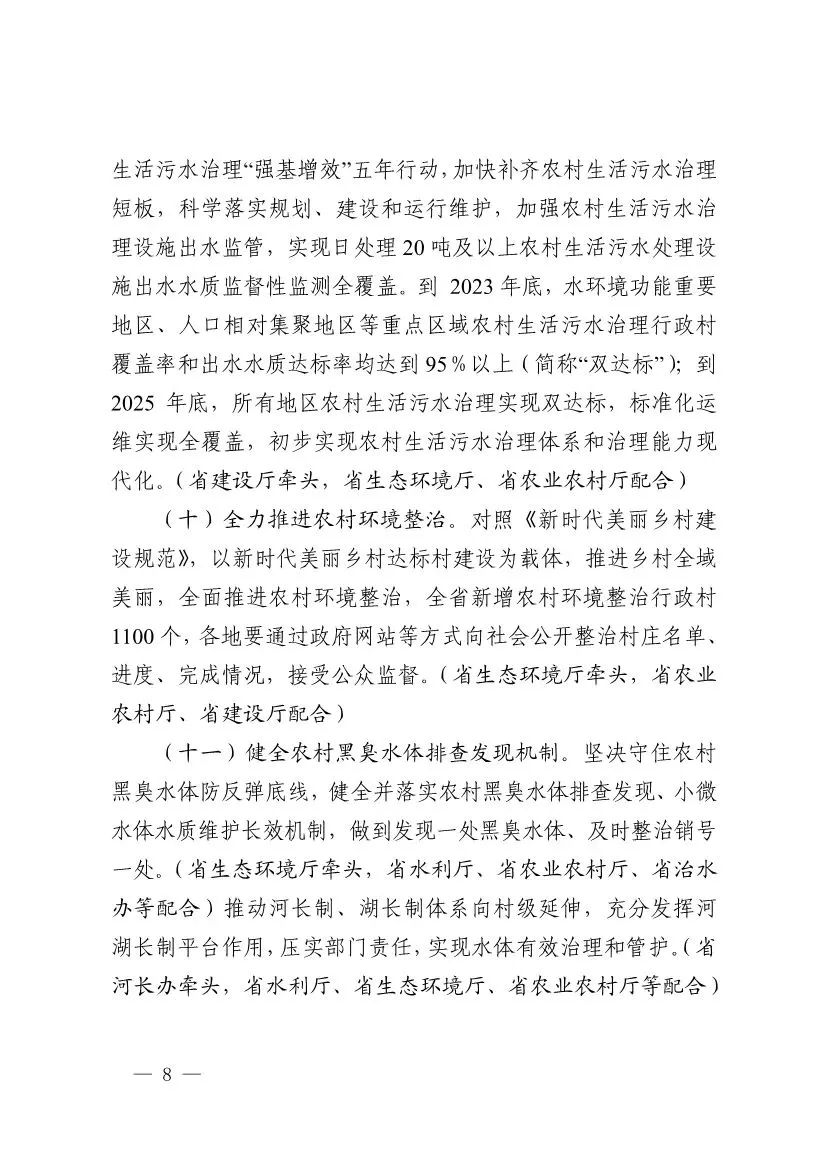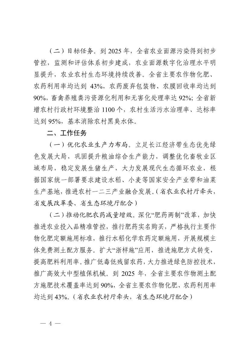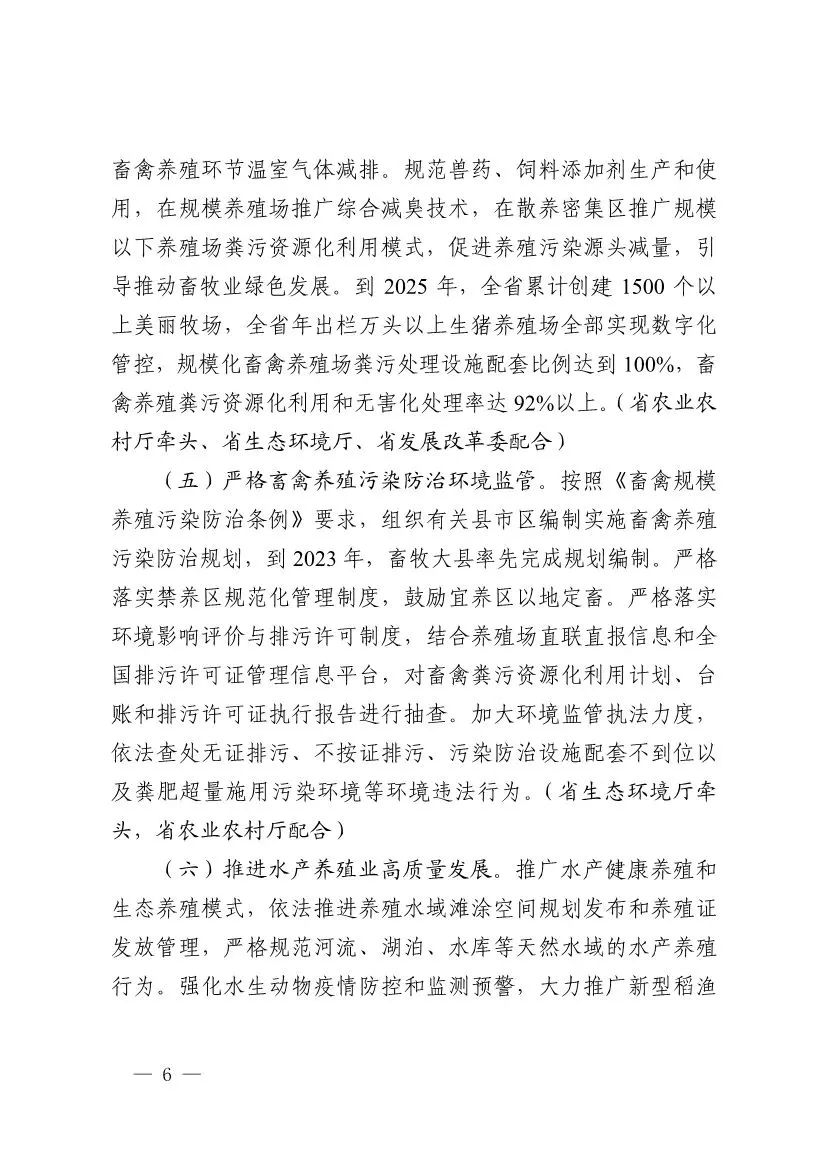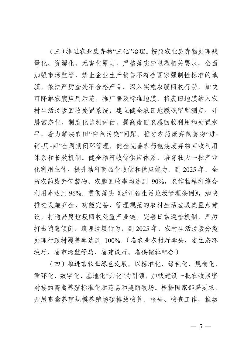 2022年6月9日,浙江省生態(tài)環(huán)境廳、浙江省發(fā)展改革委、浙江省農(nóng)業(yè)農(nóng)村廳等六部門聯(lián)合印發(fā)《浙江省農(nóng)業(yè)農(nóng)村污染治理攻堅(jiān)戰(zhàn)行動(dòng)方案(2022—2025年)》,要求到2025年,全省農(nóng)業(yè)面源污染得到初步管控,主要農(nóng)作物化肥、農(nóng)藥利用率均達(dá)到43%,農(nóng)藥廢棄包裝物、農(nóng)膜回收率均達(dá)到90%,畜禽養(yǎng)殖糞污資源化利用和無害化處理率達(dá)92%;全省新增農(nóng)村行政村環(huán)境整治1100個(gè),農(nóng)村生活污水治理率、達(dá)標(biāo)率達(dá)到95%,基本消除農(nóng)村黑臭水體。