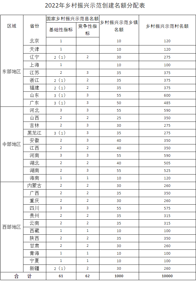 2022年,立足縣、鄉(xiāng)、村資源稟賦和發(fā)展基礎(chǔ),體現(xiàn)東、中、西部區(qū)域特色,農(nóng)業(yè)農(nóng)村部、國(guó)家鄉(xiāng)村振興局組織創(chuàng)建100個(gè)左右國(guó)家鄉(xiāng)村振興示范縣,省級(jí)農(nóng)業(yè)農(nóng)村部門、鄉(xiāng)村振興局組織創(chuàng)建1000個(gè)左右鄉(xiāng)村振興示范鄉(xiāng)鎮(zhèn)、10000個(gè)左右鄉(xiāng)村振興示范村,分層級(jí)推進(jìn)示范創(chuàng)建。力爭(zhēng)用5年左右時(shí)間,開展創(chuàng)建工作的國(guó)家鄉(xiāng)村振興示范縣基本覆蓋全國(guó)各市(地、州、盟)。各地要結(jié)合年度重點(diǎn)工作部署,扎實(shí)推進(jìn)示范創(chuàng)建工作。