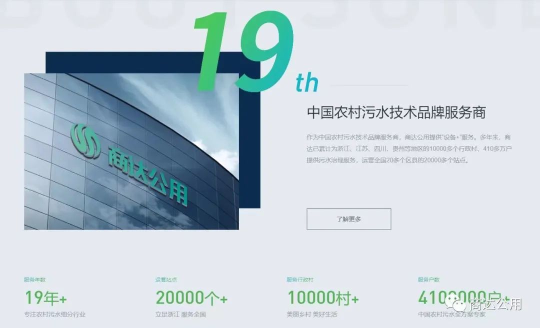 商達公用成立于2000年,深耕于農(nóng)村污水細分行業(yè)19年。作為中國農(nóng)村污水技術(shù)品牌服務(wù)商,商達公用提供 “設(shè)備+全方案”服務(wù)。19年來,已累計為全國410萬戶1200萬人提供污水治理服務(wù),運營全國20個區(qū)縣的20000個站點。作為國家高新技術(shù)企業(yè),商達公用自2000年成立以來,榮獲省市各項榮譽。2019年。在E2O的村鎮(zhèn)污水處理年度盤點中,商達公用農(nóng)村污水處理總規(guī)模、設(shè)備供應(yīng)總規(guī)模處于全國第一。2020年,商達公用被浙江省人民政府辦公廳評為 “隱形冠軍”培育企業(yè),2021年,商達公用被浙江省人民政府辦公廳評為 “專精特新”企業(yè)。