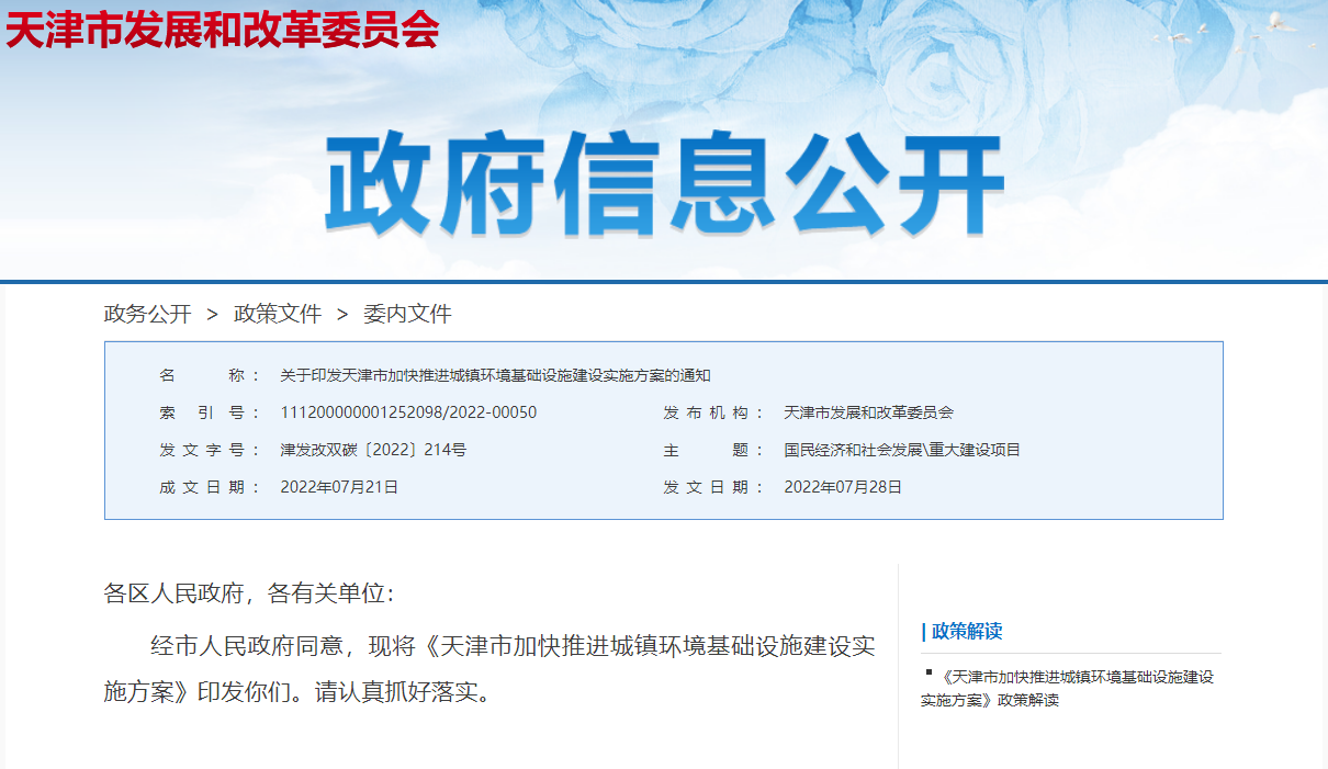 為加快推進(jìn)本市城鎮(zhèn)環(huán)境基礎(chǔ)設(shè)施建設(shè),提升基礎(chǔ)設(shè)施現(xiàn)代化水平,推動生態(tài)文明建設(shè)和綠色發(fā)展,日前,天津市發(fā)展改革委、市生態(tài)環(huán)境局、市水務(wù)局、市城市管理委、市衛(wèi)生健康委等5個部門共同發(fā)布《天津市加快推進(jìn)城鎮(zhèn)環(huán)境基礎(chǔ)設(shè)施建設(shè)實施方案》?!斗桨浮?/span>圍繞污水、垃圾、固體廢物、危險廢物、醫(yī)療廢物處理處置,提出我市城鎮(zhèn)環(huán)境基礎(chǔ)設(shè)施建設(shè)的主要目標(biāo)及具體落實措施。