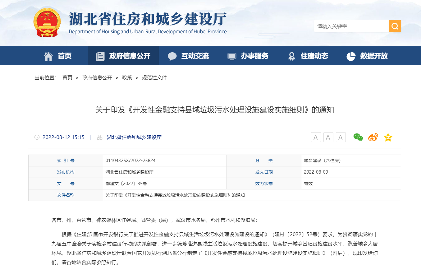 近日,湖北省住建廳發(fā)布關(guān)于印發(fā)《開發(fā)性金融支持縣域垃圾污水處理設(shè)施建設(shè)實(shí)施細(xì)則》的通知,力爭(zhēng)完成“十四五”期間湖北省縣域垃圾污水處理設(shè)施高標(biāo)準(zhǔn)全覆蓋的工作目標(biāo)。