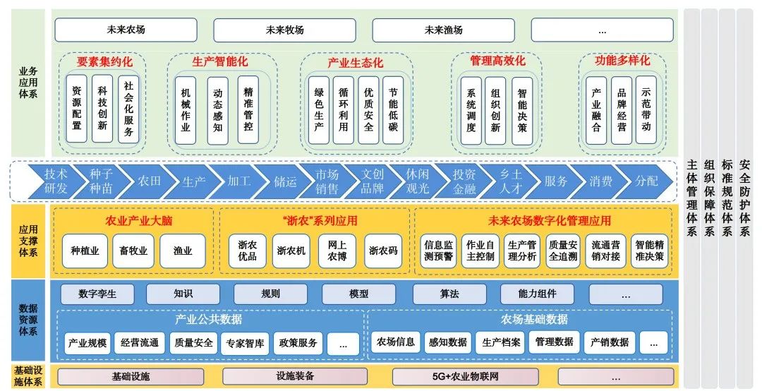 未來(lái)農(nóng)場(chǎng)的建設(shè)可概括為“3+5+N”,“3”為農(nóng)業(yè)產(chǎn)業(yè)大腦、“浙農(nóng)”系列應(yīng)用、未來(lái)農(nóng)場(chǎng)數(shù)字化管理應(yīng)用等三個(gè)關(guān)鍵支撐;“5”為5項(xiàng)能力建設(shè);“N”為未來(lái)農(nóng)場(chǎng)、未來(lái)牧場(chǎng)、未來(lái)漁場(chǎng)等N個(gè)應(yīng)用場(chǎng)景。未來(lái)農(nóng)場(chǎng)建設(shè)構(gòu)架如下圖所示。