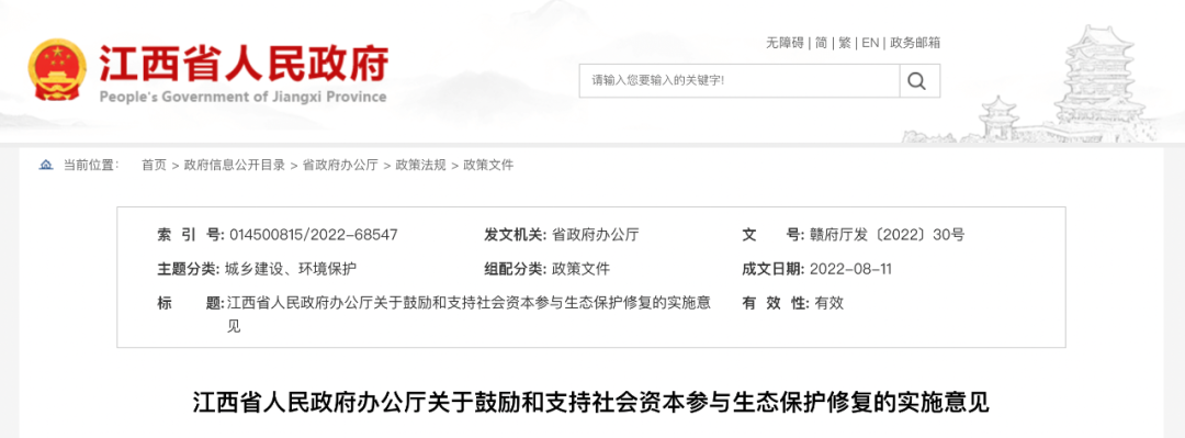 為貫徹落實(shí)《國(guó)務(wù)院辦公廳關(guān)于鼓勵(lì)和支持社會(huì)資本參與生態(tài)保護(hù)修復(fù)的意見(jiàn)》(國(guó)辦發(fā)〔2021〕40號(hào))精神,促進(jìn)社會(huì)資本參與全省生態(tài)保護(hù)修復(fù)工作,全面服務(wù)美麗中國(guó)“江西樣板”建設(shè),經(jīng)省政府同意,結(jié)合我省實(shí)際,現(xiàn)提出以下實(shí)施意見(jiàn)。以習(xí)近平生態(tài)文明思想為指導(dǎo),全面貫徹黨的十九大和十九屆歷次全會(huì)以及省第十五次黨代會(huì)精神,踐行“綠水青山就是金山銀山”理念,堅(jiān)持“生態(tài)優(yōu)先、綠色發(fā)展”戰(zhàn)略定位,重點(diǎn)圍繞全省國(guó)土空間生態(tài)保護(hù)修復(fù)總體布局,以解決生態(tài)系統(tǒng)問(wèn)題為導(dǎo)向,以市場(chǎng)化、多元化投融資為支撐,增強(qiáng)生態(tài)產(chǎn)品供給能力,激活釋放政策紅利,健全完善生態(tài)保護(hù)修復(fù)投入機(jī)制,實(shí)現(xiàn)生態(tài)效益、社會(huì)效益和經(jīng)濟(jì)效益相統(tǒng)一,為推動(dòng)全省高質(zhì)量發(fā)展、加快建設(shè)美麗中國(guó)“江西樣板”奠定堅(jiān)實(shí)的生態(tài)基礎(chǔ)。(一)自然生態(tài)系統(tǒng)保護(hù)修復(fù)。針對(duì)受損、退化、功能下降的森林、草地、濕地、河流、湖泊等自然生態(tài)系統(tǒng),開(kāi)展水土流失防治、崩崗綜合治理、石漠化防治、河道保護(hù)治理、水生態(tài)保護(hù)修復(fù)、濕地生態(tài)保護(hù)修復(fù)、野生動(dòng)植物種群保護(hù)恢復(fù)、生物多樣性保護(hù)、水源涵養(yǎng)、森林質(zhì)量提升、中幼林撫育、退化林(草)地修復(fù)、人工商品林建設(shè)等。全面提升生態(tài)系統(tǒng)碳匯能力,增加碳匯增量,鼓勵(lì)開(kāi)發(fā)碳匯項(xiàng)目??茖W(xué)評(píng)估界定自然保護(hù)地保護(hù)和建設(shè)范圍,引導(dǎo)當(dāng)?shù)鼐用窈凸娼M織等參與科普宣教、自然體驗(yàn)、紅色教育、科學(xué)實(shí)驗(yàn)等活動(dòng)和特許經(jīng)營(yíng)項(xiàng)目。(二)農(nóng)田生態(tài)系統(tǒng)保護(hù)修復(fù)。針對(duì)生態(tài)功能減弱、空間布局破碎、生物多樣性減少、開(kāi)發(fā)利用與生態(tài)保護(hù)矛盾突出的農(nóng)田生態(tài)系統(tǒng),開(kāi)展全域土地綜合整治,實(shí)施農(nóng)用地整理、建設(shè)用地整理、鄉(xiāng)村生態(tài)保護(hù)修復(fù)、土地復(fù)墾、生物多樣性保護(hù)等,改善農(nóng)田生境和條件。(三)城鎮(zhèn)生態(tài)系統(tǒng)保護(hù)修復(fù)。針對(duì)城鎮(zhèn)生態(tài)系統(tǒng)連通不暢、空間結(jié)構(gòu)不合理、生態(tài)空間不足等問(wèn)題,實(shí)施生態(tài)廊道、生態(tài)清潔小流域、水系連通工程、生態(tài)基礎(chǔ)設(shè)施和生態(tài)網(wǎng)絡(luò)建設(shè),提升城鎮(zhèn)生態(tài)系統(tǒng)質(zhì)量和穩(wěn)定性。