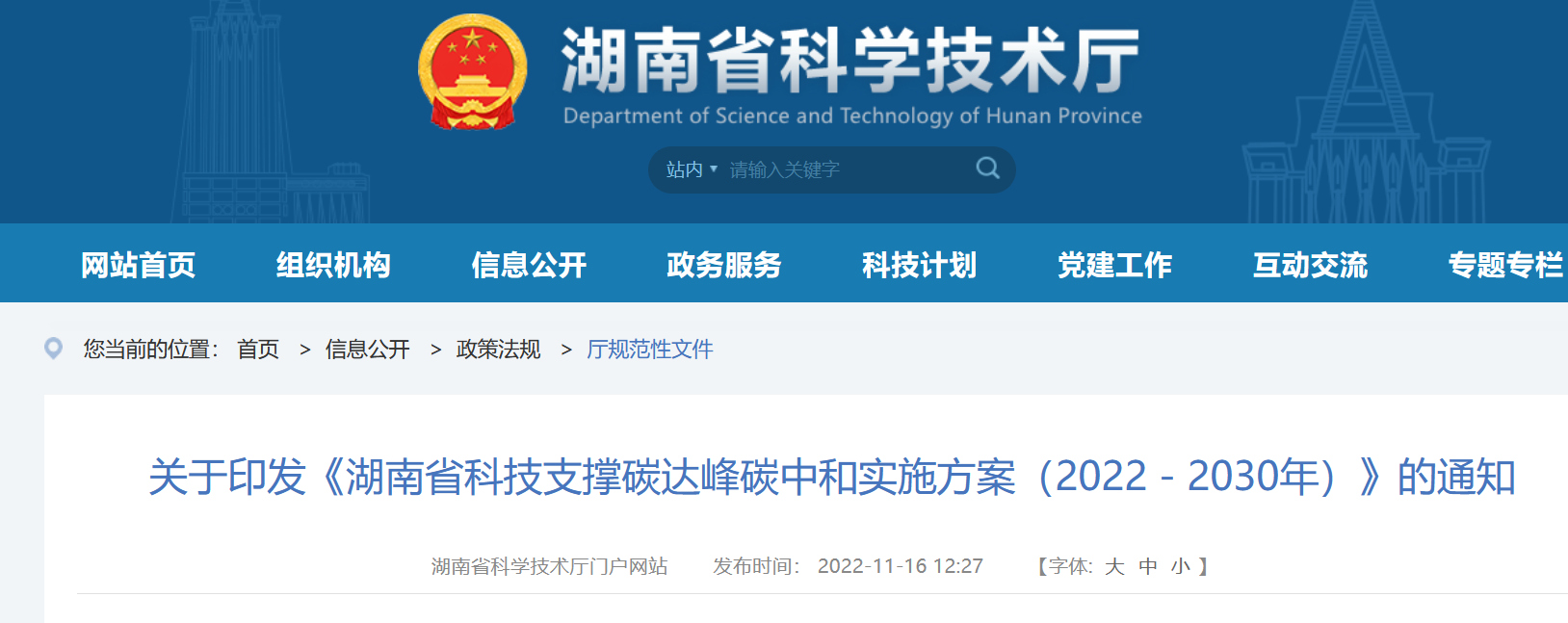 11月16日,湖南省科學技術廳印發(fā)《湖南省科技支撐碳達峰碳中和實施方案(2022-2030年)》(以下簡稱《方案》)的通知。
