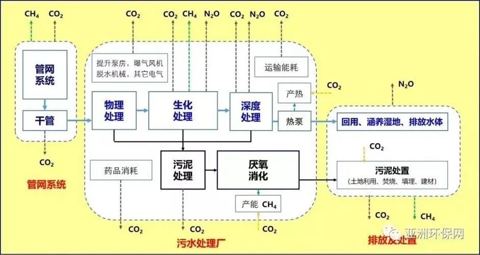 污水處理過(guò)程實(shí)際就是碳排放的過(guò)程,污水處理行業(yè)的碳排放量約占全社會(huì)總排放量的1%,在環(huán)保產(chǎn)業(yè)中占比最大。污水處理過(guò)程中會(huì)排放二氧化碳、甲烷和氧化亞氮。其中,二氧化碳主要來(lái)源于污水治理設(shè)施的能耗過(guò)程,而水污染物降解產(chǎn)生的二氧化碳則認(rèn)定為生源性碳排放;甲烷主要來(lái)源于污水處理厭氧環(huán)節(jié),包括管網(wǎng)、厭氧池、化糞池、污泥厭氧消化池等;氧化亞氮主要來(lái)源于污水處理過(guò)程的硝化反硝化階段。