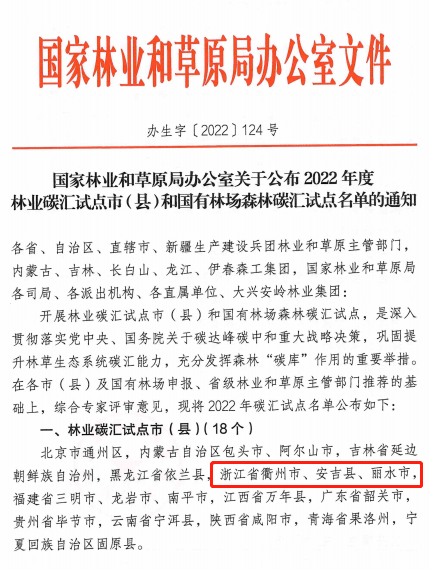 近日,國家林業(yè)和草原局辦公室公布了2022年度林業(yè)碳匯試點(diǎn)市(縣)名單。經(jīng)各市(縣)及國有林場(chǎng)申報(bào)、省級(jí)林草主管部門推薦,全國共18個(gè)市(縣)和21個(gè)國有林場(chǎng)入選。浙江省衢州市、安吉縣、麗水市成功入選林業(yè)碳匯試點(diǎn)市(縣)建設(shè)名單。