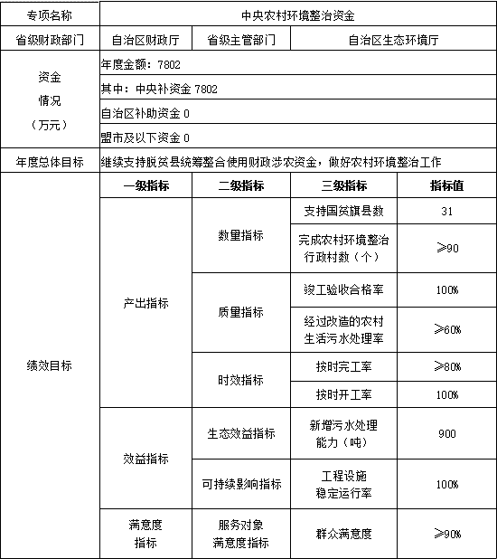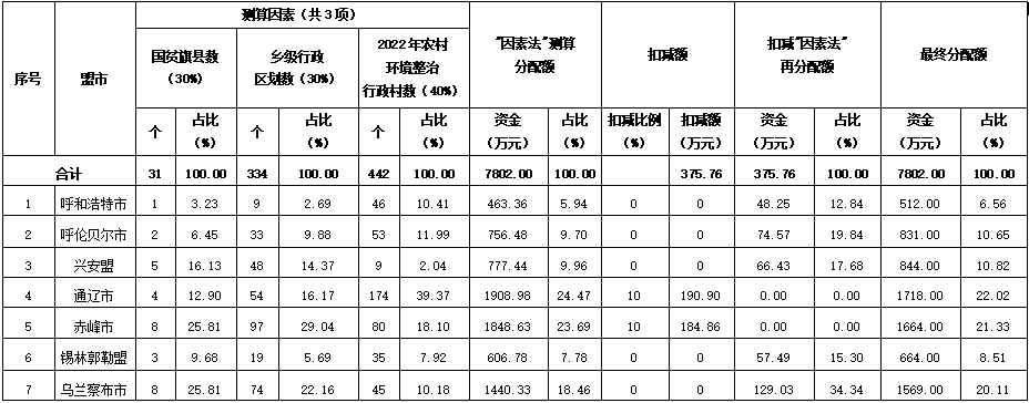 內(nèi)蒙古自治區(qū)財政廳達(dá)2022年中央農(nóng)村環(huán)境整治資金,共計7802萬元,用于農(nóng)村生活污水處理等領(lǐng)域。詳情如下:內(nèi)蒙古自治區(qū)財政廳關(guān)于下達(dá)2022年中央農(nóng)村環(huán)境整治資金的通知各有關(guān)盟市財政局:根據(jù)《財政部關(guān)于下達(dá)2022年農(nóng)村環(huán)境整治資金預(yù)算的通知》(財資環(huán)〔2022〕156號)和《自治區(qū)生態(tài)環(huán)境廳關(guān)于2022年中央農(nóng)村環(huán)境整治資金分配建議的函》(內(nèi)環(huán)函〔2023〕39號),現(xiàn)下達(dá)2022年中央農(nóng)村環(huán)境整治資金7802萬元,并就有關(guān)事項通知如下:一、資金下達(dá)具體地區(qū)及分配金額詳見附件1,項目代碼:10000017Z175060020003,支出列2022年政府收支分類科目:2110402-節(jié)能環(huán)保支出-農(nóng)村環(huán)境保護。二、請相關(guān)盟市按照《財政部關(guān)于印發(fā)<農(nóng)村環(huán)境整治資金管理辦法>的通知》(財資環(huán)〔2021〕43號)等有關(guān)要求,加強資金管理,加快預(yù)算執(zhí)行,切實提升財政資金使用效益。三、根據(jù)《內(nèi)蒙古自治區(qū)農(nóng)村環(huán)境整治資金管理辦法》中“農(nóng)村牧區(qū)環(huán)境綜合整治任務(wù)量、鄉(xiāng)級行政區(qū)劃數(shù)量、項目儲備情況等因素,分配權(quán)重分別為40%、30%、30%”,結(jié)合財政部等11部門《關(guān)于繼續(xù)支持脫貧縣統(tǒng)籌整合使用財政涉農(nóng)資金工作的通知》(財農(nóng)〔2021〕22號)要求,將“項目儲備情況”因素替換為“國貧旗縣數(shù)”。結(jié)合資金分配原則和我區(qū)實際,采用國家扶貧開發(fā)重點旗縣個數(shù)(權(quán)重為30%)、鄉(xiāng)級行政區(qū)劃數(shù)(權(quán)重為30%)、2022年已完成農(nóng)村環(huán)境整治行政村個數(shù)(權(quán)重為40%)3項因素進行測算。盟市資金分配額=分配資金額×(該盟市國家級扶貧開發(fā)重點旗縣個數(shù)/自治區(qū)國家級扶貧開發(fā)重點旗縣總數(shù)×0.3+該盟市國家級扶貧開發(fā)重點旗縣所屬鄉(xiāng)級行政區(qū)劃數(shù)/自治區(qū)國家級扶貧開發(fā)重點旗縣鄉(xiāng)級行政區(qū)劃總數(shù)×0.3+該盟市2022年度完成農(nóng)村環(huán)境整治行政村數(shù)/自治區(qū)有國家級扶貧開發(fā)重點旗縣的盟市2022年完成農(nóng)村環(huán)境整治行政村總數(shù)×0.4)。四、資金扣減。本次資金分配對2021年污染防治攻堅戰(zhàn)考核中生態(tài)環(huán)保資金使用績效排名后三位盟市扣減2022年中央專項資金預(yù)算應(yīng)分配額度的10%,本次涉及資金扣減盟市為通遼市、赤峰市。五、資金重點用于已納入中央農(nóng)村環(huán)境整治項目儲備庫的項目。請相關(guān)盟市加強項目管理,強化項目全過程監(jiān)管和實施情況調(diào)度,確保資金專款專用,切實提高項目進度和預(yù)算執(zhí)行率。落實生態(tài)環(huán)保項目儲備制度有關(guān)要求,按照“資金跟著項目走”的原則,做好項目儲備工作,盡快形成有效投資,避免“資金等項目”。對已從中央基建投資等其他渠道獲得中央財政資金支持的項目,不得納入資金支持范圍。請有關(guān)盟市采取有效措施,增強預(yù)算執(zhí)行力,嚴(yán)禁擠占、截留、挪用。資金使用撥付執(zhí)行國庫集中支付和政府采購制度。六、請有關(guān)盟市按照《中共中央國務(wù)院關(guān)于全面實施預(yù)算績效管理的意見》的要求,科學(xué)設(shè)定績效目標(biāo),做好績效監(jiān)控和績效評價,確保財政資金安全有效。同時,請參照自治區(qū)做法,將你盟市績效目標(biāo)及時對下分解,做好預(yù)算績效管理工作。請將2022年中央農(nóng)村環(huán)境整治資金分配、使用情況及《農(nóng)村環(huán)境整治資金區(qū)域績效目標(biāo)申報表》(附件2)和分解下達(dá)績效目標(biāo)于收文30日內(nèi)報自治區(qū)財政廳和生態(tài)環(huán)境廳備案,同時抄送財政部內(nèi)蒙古監(jiān)管局。附件1 2022年中央農(nóng)村環(huán)境整治專項資金分配情況表附件2 2022年中央農(nóng)村環(huán)境整治資金區(qū)域績效目標(biāo)表