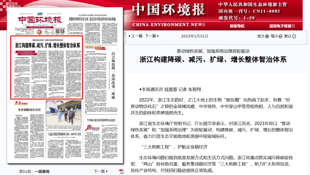2022年,浙江開展全國(guó)首個(gè)減污降碳協(xié)同增效創(chuàng)新區(qū)建設(shè),首創(chuàng)減污降碳協(xié)同指數(shù);推動(dòng)“雙碳智治”“浙里無廢”等13個(gè)重大多跨應(yīng)用,歸集各類數(shù)據(jù)166億條,形成場(chǎng)景應(yīng)用“一本賬”,成為全國(guó)唯一生態(tài)環(huán)境數(shù)字化改革和生態(tài)環(huán)境“大腦”建設(shè)試點(diǎn)省。改革創(chuàng)新的能量不斷釋放、效應(yīng)不斷顯現(xiàn)。