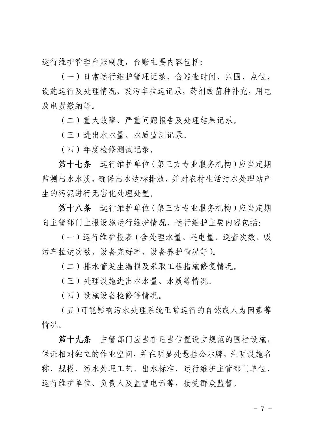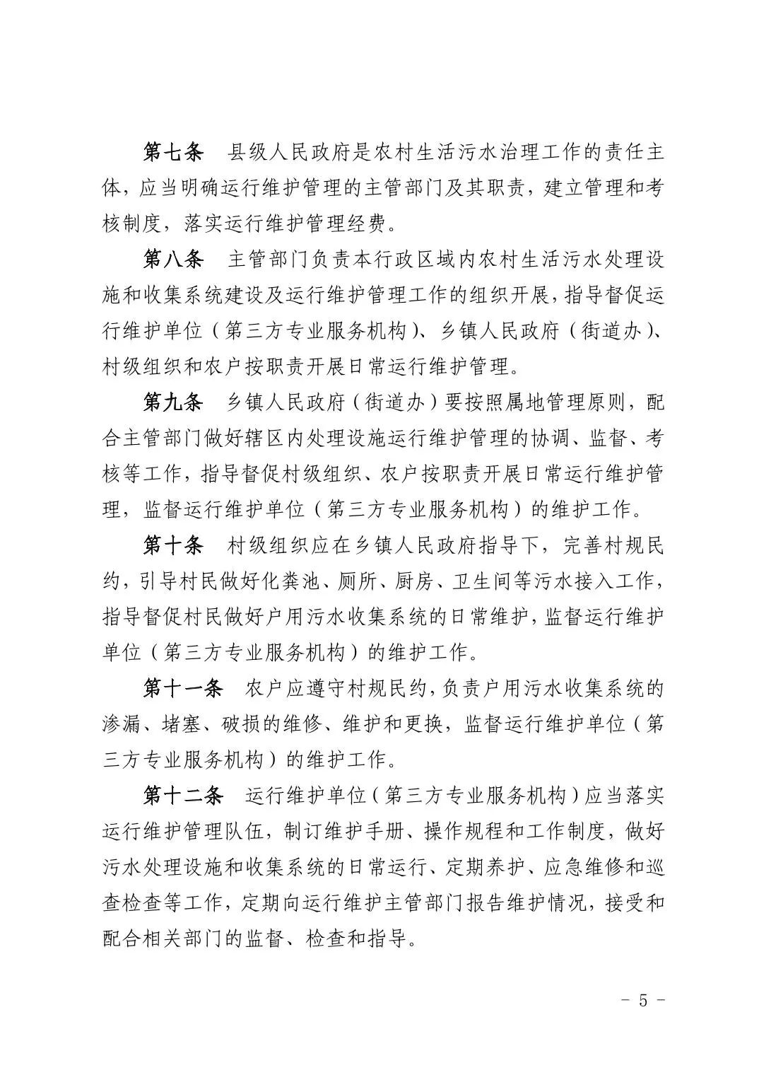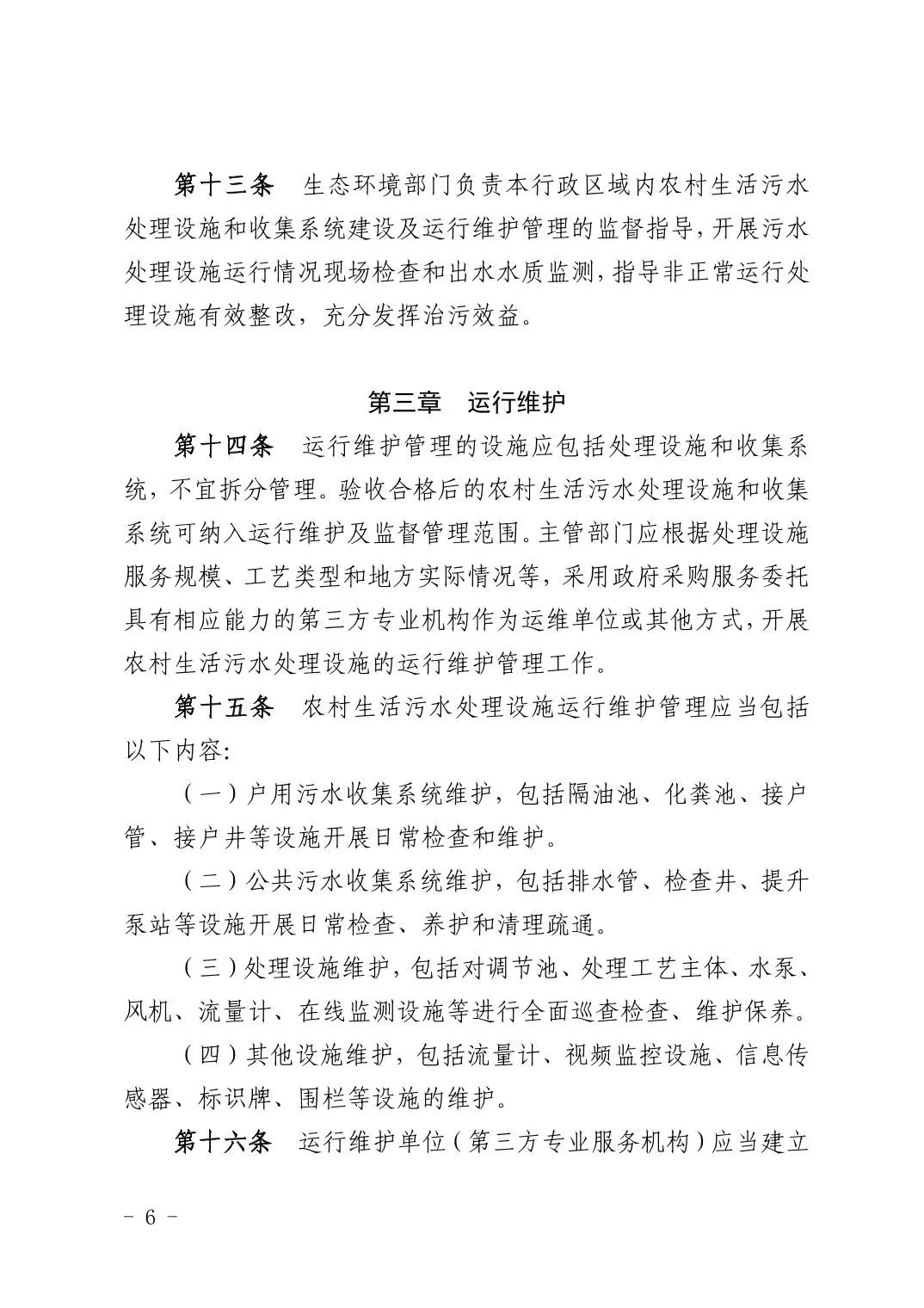 《辦法》明確了各部門職責分工,在運行維護、資金保障、監(jiān)督考核等方面提出了規(guī)范要求。明確建立健全以縣級人民政府為責任主體、主管部門為管理主體、鄉(xiāng)鎮(zhèn)人民政府和村級組織為協(xié)管主體、農(nóng)戶為受益主體、運行維護單位為服務(wù)主體、生態(tài)環(huán)境部門為監(jiān)管主體的“六位一體”農(nóng)村生活污水處理設(shè)施運行維護管理體系。