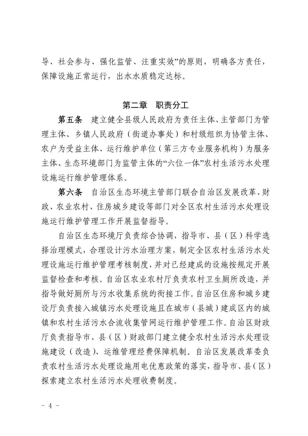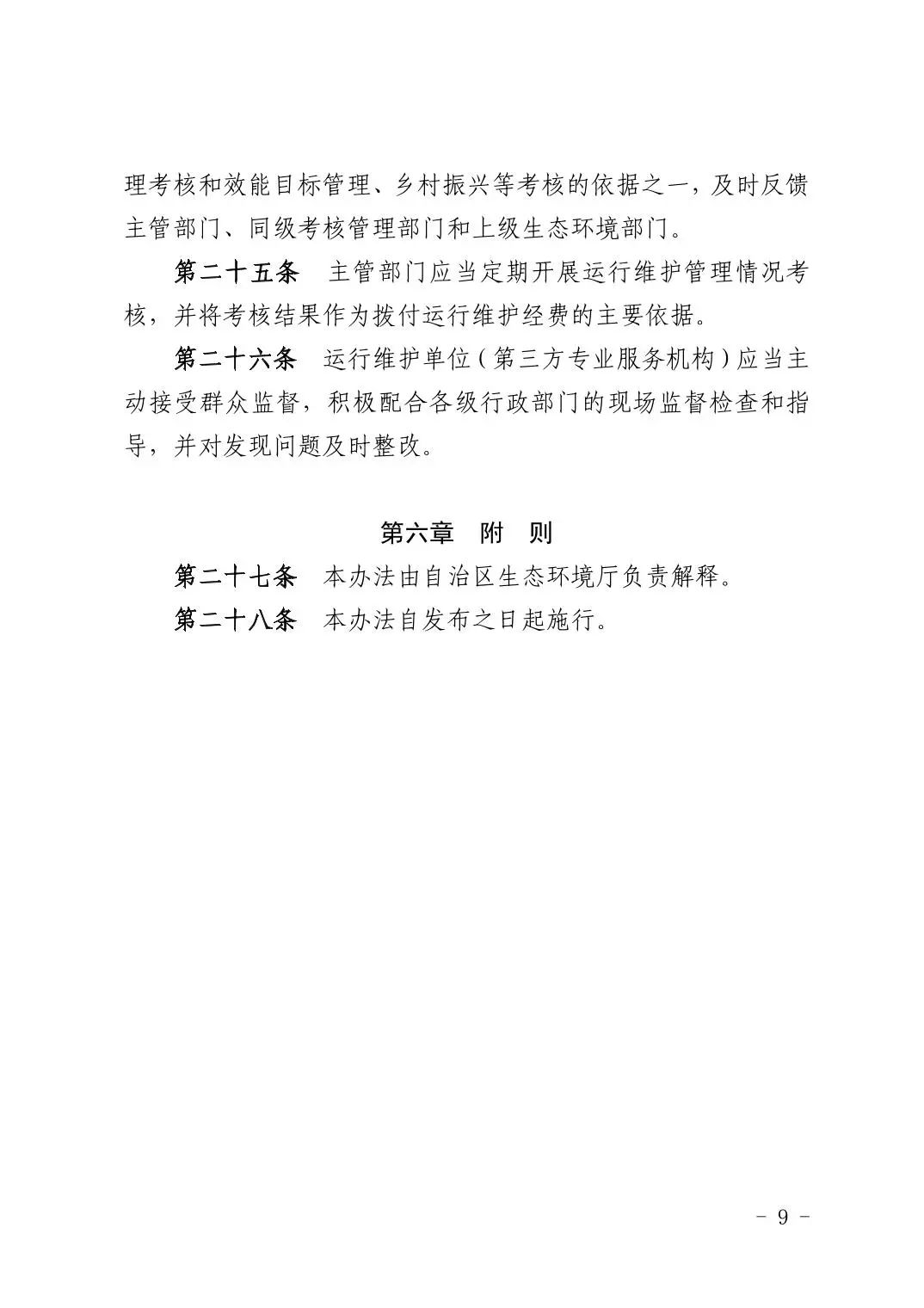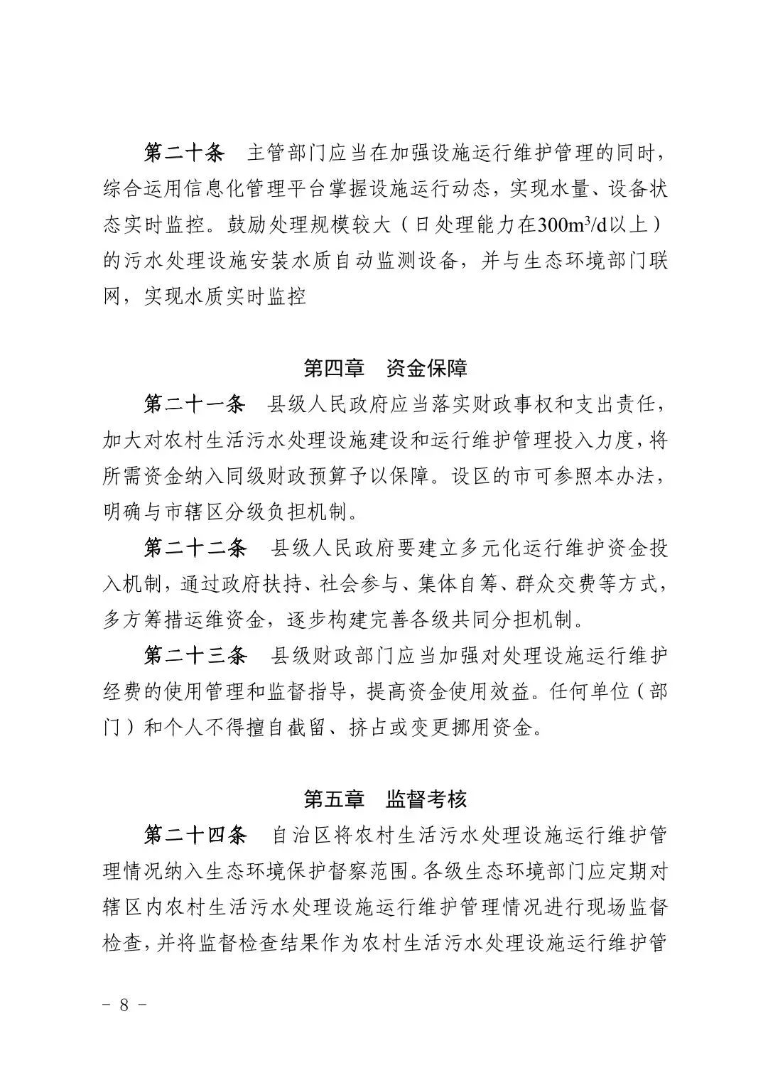 在資金運維上,《辦法》規(guī)定由自治區(qū)財政廳負責指導市、縣(區(qū))財政部門建立健全農(nóng)村生活污水處理設(shè)施建設(shè)或改造、運維管理經(jīng)費保障機制;縣級人民政府應(yīng)當加大對農(nóng)村生活污水處理設(shè)施建設(shè)和運行維護管理投入力度,將所需資金納入同級財政預算予以保障,建立多元化運行維護資金投入機制,通過政府扶持、社會參與、集體自籌、群眾交費等方式,多方籌措運維資金,逐步構(gòu)建完善各級共同分擔機制,任何單位(部門)和個人不得擅自截留、擠占或變更挪用資金。