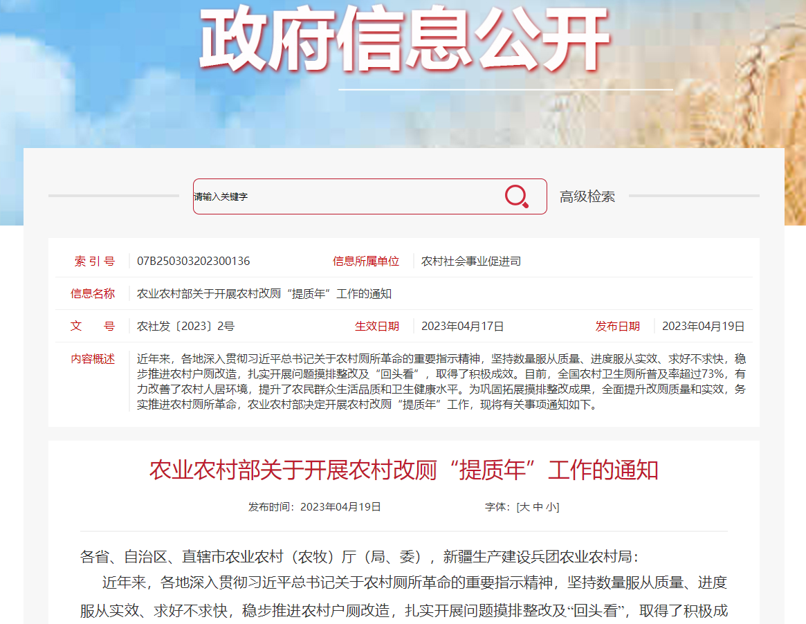 各省、自治區(qū)、直轄市農(nóng)業(yè)農(nóng)村(農(nóng)牧)廳(局、委),新疆生產(chǎn)建設(shè)兵團(tuán)農(nóng)業(yè)農(nóng)村局:近年來(lái),各地深入貫徹習(xí)近平總書記關(guān)于農(nóng)村廁所革命的重要指示精神,堅(jiān)持?jǐn)?shù)量服從質(zhì)量、進(jìn)度服從實(shí)效、求好不求快,穩(wěn)步推進(jìn)農(nóng)村戶廁改造,扎實(shí)開展問(wèn)題摸排整改及“回頭看”,取得了積極成效。目前,全國(guó)農(nóng)村衛(wèi)生廁所普及率超過(guò)73%,有力改善了農(nóng)村人居環(huán)境,提升了農(nóng)民群眾生活品質(zhì)和衛(wèi)生健康水平。為鞏固拓展摸排整改成果,全面提升改廁質(zhì)量和實(shí)效,務(wù)實(shí)推進(jìn)農(nóng)村廁所革命,農(nóng)業(yè)農(nóng)村部決定開展農(nóng)村改廁“提質(zhì)年”工作,現(xiàn)將有關(guān)事項(xiàng)通知如下。通過(guò)開展農(nóng)村改廁“提質(zhì)年”工作,聚焦重點(diǎn)問(wèn)題、緊盯薄弱環(huán)節(jié)、強(qiáng)化規(guī)范管理,推動(dòng)工作機(jī)制不斷完善和工作作風(fēng)進(jìn)一步改進(jìn),推進(jìn)問(wèn)題廁所扎實(shí)整改、新建廁所質(zhì)量過(guò)硬、長(zhǎng)效管護(hù)機(jī)制建立健全、財(cái)政資金使用安全有效、農(nóng)民群眾參與度滿意度明顯提高,切實(shí)提高農(nóng)村改廁工作質(zhì)量。