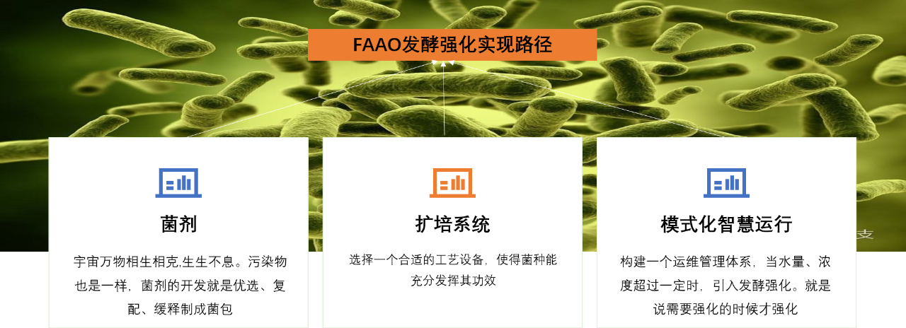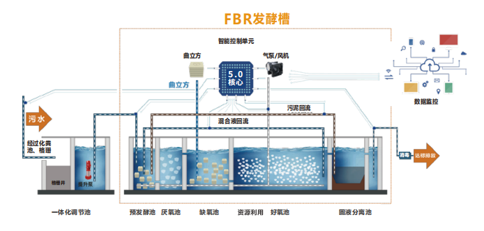 FAAO工藝(預發(fā)酵-改良A/A/O工藝)。FBR發(fā)酵槽在前端設置預發(fā)酵池,含有高活性、高密度菌液污水從預發(fā)酵池擴散,強化脫氮除磷效率。解決了農(nóng)村污水低碳氮比環(huán)境下除磷脫氮的行業(yè)難題。