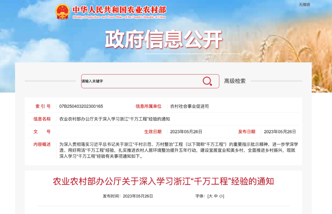 為深入貫徹落實(shí)習(xí)近平總書記關(guān)于浙江“千村示范、萬村整治”工程(以下簡稱“千萬工程”)的重要指示批示精神,進(jìn)一步學(xué)深學(xué)透、用好用活“千萬工程”經(jīng)驗(yàn),扎實(shí)推進(jìn)農(nóng)村人居環(huán)境整治提升五年行動,建設(shè)宜居宜業(yè)和美鄉(xiāng)村,全面推進(jìn)鄉(xiāng)村振興,現(xiàn)就深入學(xué)習(xí)“千萬工程”經(jīng)驗(yàn)有關(guān)事項(xiàng)通知如下。