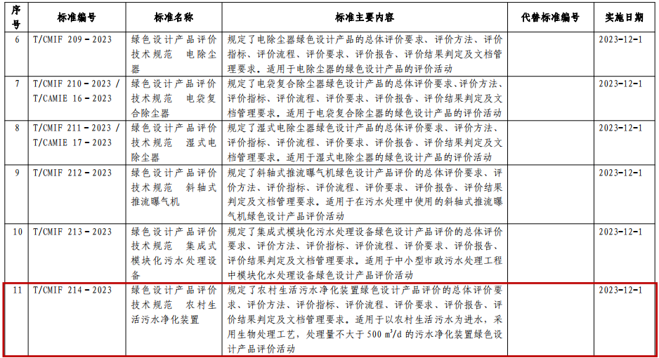 2023年10月10日,根據(jù)《中國機械工業(yè)聯(lián)合會團(tuán)體標(biāo)準(zhǔn)管理辦法》和《中國機械工業(yè)聯(lián)合會團(tuán)體標(biāo)準(zhǔn)制定工作細(xì)則》的有關(guān)規(guī)定,中國機械工業(yè)聯(lián)合會批準(zhǔn)17項中國機械工業(yè)聯(lián)合會團(tuán)體標(biāo)準(zhǔn)。由商達(dá)公用起草主編的T/CMIF 214-2023《綠色設(shè)計產(chǎn)品評價技術(shù)規(guī)范 農(nóng)村生活污水凈化裝置》名列榜單,自2023年12月1日起正式實施。