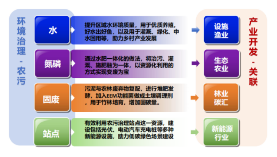 該理念是基于綠色鄉(xiāng)村 EOD 價(jià)值體系,通過機(jī)制、技術(shù)創(chuàng)新,將農(nóng)污治理與鄉(xiāng)村振興相關(guān)綠色農(nóng)業(yè)、設(shè)施漁業(yè)、碳中和、新能源等產(chǎn)業(yè)相融合,建立“生態(tài)、生產(chǎn)、生活”三生共融的生態(tài)治理模式并融合以“需求拉動(dòng)、供給推動(dòng)、貿(mào)易聯(lián)動(dòng)”為核心驅(qū)動(dòng)的高效生態(tài)產(chǎn)業(yè)發(fā)展,堅(jiān)持生態(tài)優(yōu)先、綠色發(fā)展,通過治理農(nóng)村生活污水,營(yíng)造清澈鄉(xiāng)村視界實(shí)現(xiàn)“水清岸綠、魚翔淺底”,變“生態(tài)包袱”為“綠色財(cái)富”