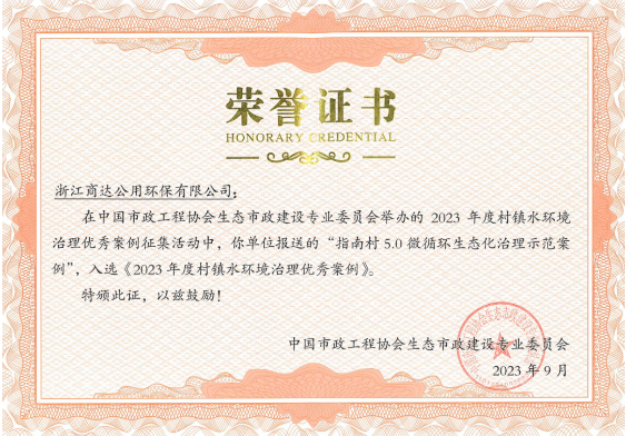 《全國(guó)村鎮(zhèn)污水治理優(yōu)秀案例》榮譽(yù)證書