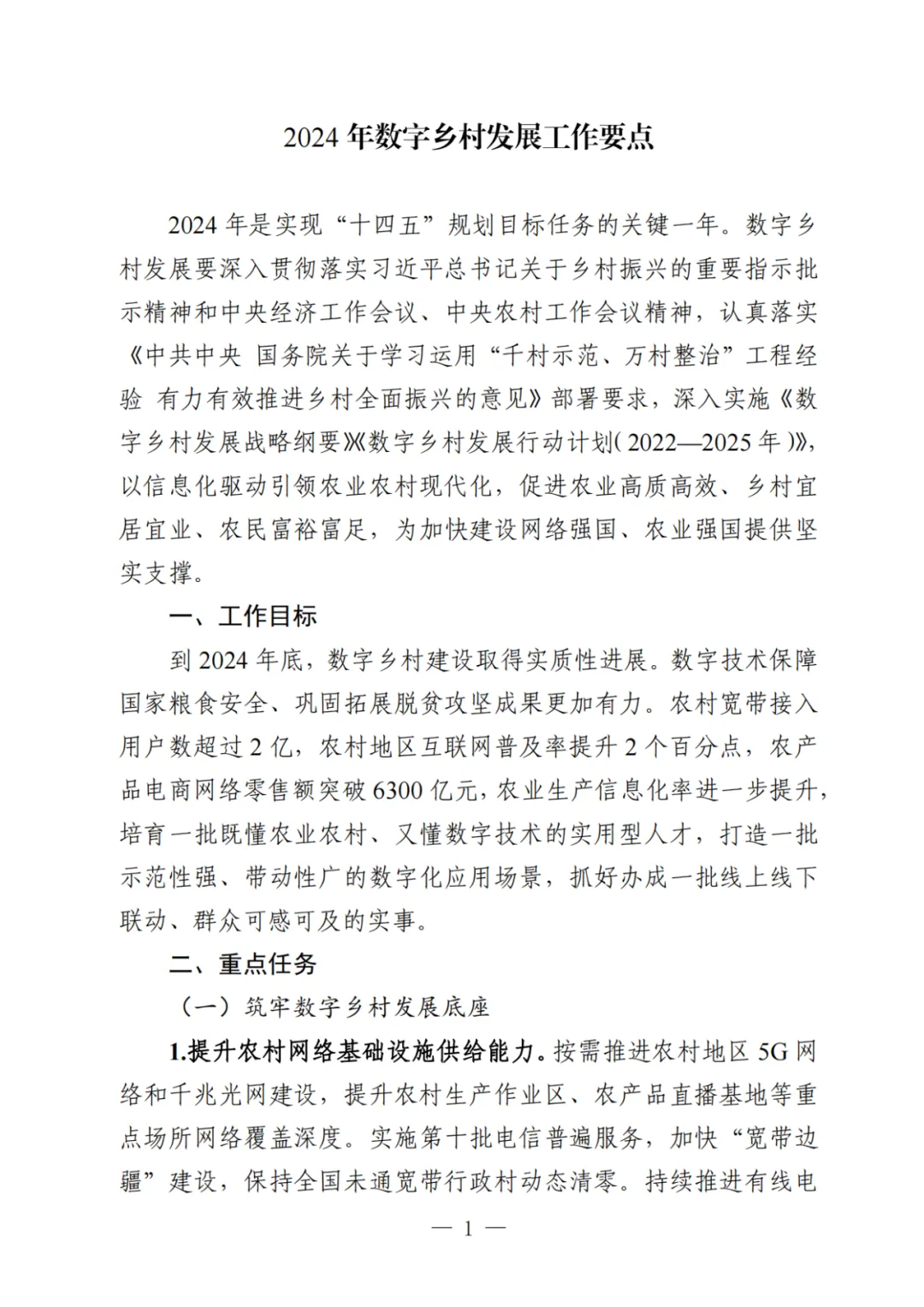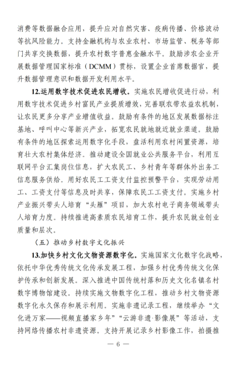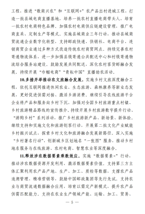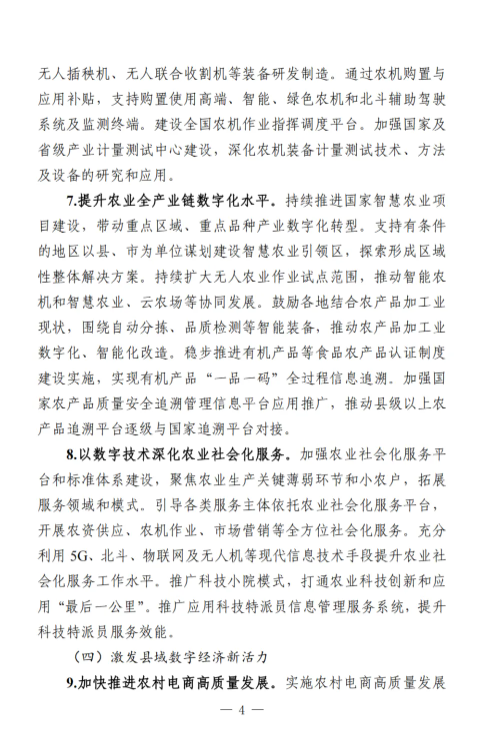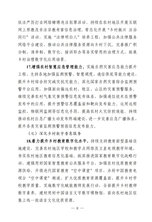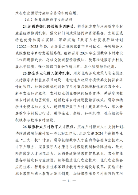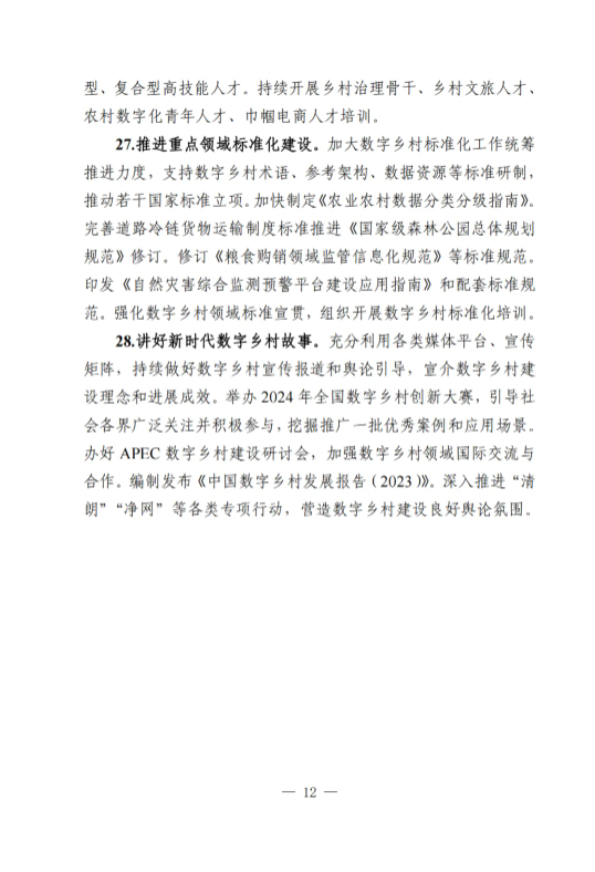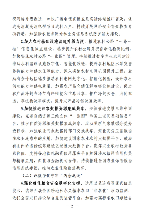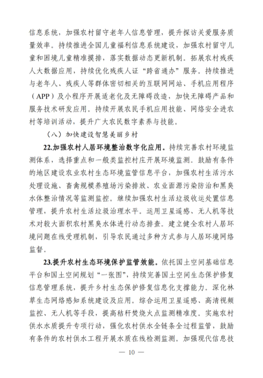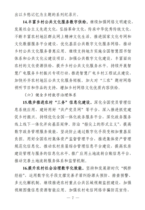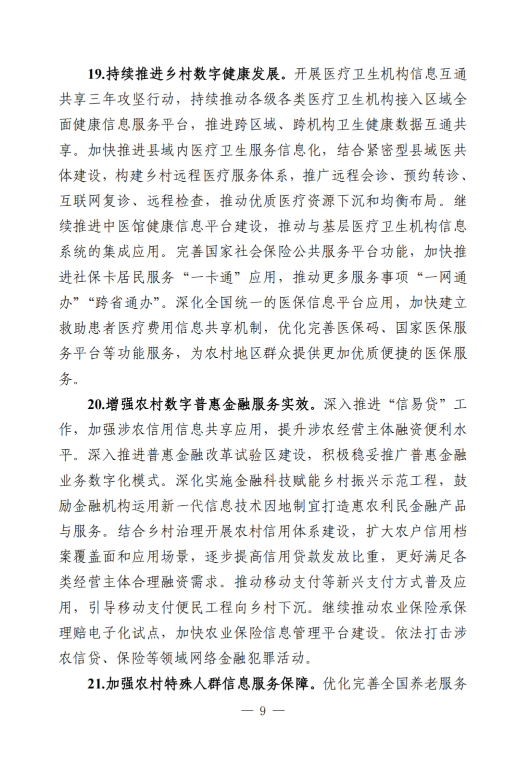 《工作要點》部署了9個方面28項重點任務。一是筑牢數字鄉(xiāng)村發(fā)展底座。包括提升農村網絡基礎設施供給能力,加大農村基礎設施改造升級力度,加快推進涉農數據資源集成共享。二是以數字化守牢“兩條底線”。包括強化確保糧食安全數字化支撐,強化防止返貧監(jiān)測和幫扶舉措。三是大力推進智慧農業(yè)發(fā)展。包括加強農業(yè)科技創(chuàng)新與應用推廣,提升農業(yè)全產業(yè)鏈數字化水平,以數字技術深化農業(yè)社會化服務。四是激發(fā)縣域數字經濟新活力。包括加快推進農村電商高質量發(fā)展,多措并舉推動農文旅融合發(fā)展,釋放涉農數據要素乘數效應,運用數字技術促進農民增收。五是推動鄉(xiāng)村數字文化振興。包括加快鄉(xiāng)村文化文物資源數字化,豐富鄉(xiāng)村公共文化服務數字供給。六是健全鄉(xiāng)村數字治理體系。包括穩(wěn)步推進農村“三務”信息化建設,提升農村社會治理數字化效能,增強農村智慧應急管理能力。七是深化鄉(xiāng)村數字普惠服務。包括著力提升鄉(xiāng)村教育數字化水平,持續(xù)推進鄉(xiāng)村數字健康發(fā)展,增強農村數字普惠金融服務實效,加強農村特殊人群信息服務保障。八是加快建設智慧美麗鄉(xiāng)村。包括加強農村人居環(huán)境整治數字化應用,提升農村生態(tài)環(huán)境保護監(jiān)管效能。九是統(tǒng)籌推進數字鄉(xiāng)村建設。包括加強跨部門跨層級協(xié)調聯動,健全多元化投入保障機制,培養(yǎng)壯大鄉(xiāng)村數字人才隊伍,推進重點領域標準化建設,講好新時代數字鄉(xiāng)村故事。