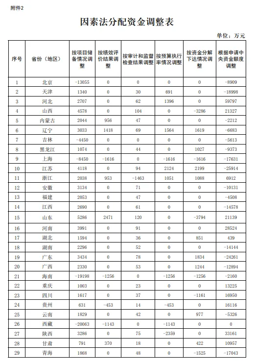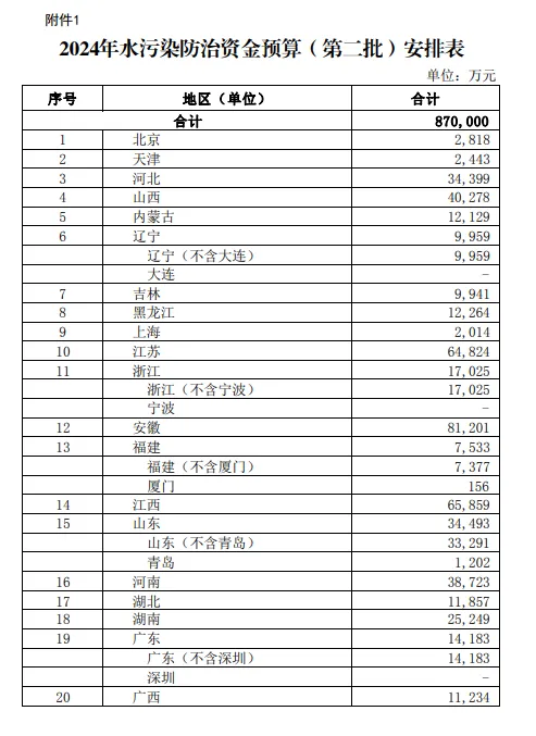 財(cái)政部關(guān)于下達(dá)2024年水污染防治資金預(yù)算(第二批)的通知財(cái)資環(huán)〔2024〕62號(hào)各省、自治區(qū)、直轄市、計(jì)劃單列市財(cái)政廳(局),新疆生產(chǎn)建設(shè)兵團(tuán)財(cái)政局: 為促進(jìn)水環(huán)境質(zhì)量改善,加快推進(jìn)水污染防治工作,現(xiàn)下達(dá)你?。ㄗ灾螀^(qū)、直轄市、新疆生產(chǎn)建設(shè)兵團(tuán)、計(jì)劃單列市,以下統(tǒng)稱?。?024年水污染防治資金(第二批),用于支持水污染防治和水生態(tài)環(huán)境保護(hù)等方面工作,并就有關(guān)事項(xiàng)通知如下: 一、各省安排金額見附件1,項(xiàng)目代碼:10000015Z155110010004,支出列2024年政府收支分類科目“211節(jié)能環(huán)保支出”。 二、各省要按照《財(cái)政部關(guān)于印發(fā)<水污染防治資金管理辦法>的通知》(財(cái)資環(huán)〔2021〕36號(hào))有關(guān)規(guī)定,加強(qiáng)資金管理,??顚S?,切實(shí)提高資金使用效益。落實(shí)生態(tài)環(huán)保項(xiàng)目儲(chǔ)備制度有關(guān)要求,按照“資金跟著項(xiàng)目走”的原則,做好項(xiàng)目儲(chǔ)備工作,盡快形成有效投資,避免“資金等項(xiàng)目”。對已從中央基建投資等其他渠道獲得中央財(cái)政資金支持的項(xiàng)目,不得納入防治資金支持范圍。 三、此次下達(dá)資金對建立起橫向生態(tài)保護(hù)補(bǔ)償機(jī)制且完成年度清算的四川省、重慶市、湖北省、湖南省、江西省、安徽省、江蘇省分別給予獎(jiǎng)勵(lì),獎(jiǎng)勵(lì)資金從其他未建立起機(jī)制的省份中扣減。同時(shí),對河北省、北京市簽訂潮白河流域補(bǔ)償協(xié)議,積極推動(dòng)流域橫向生態(tài)保護(hù)補(bǔ)償機(jī)制建設(shè)給予肯定和鼓勵(lì),后續(xù)將視省級(jí)資金清算情況進(jìn)行獎(jiǎng)勵(lì)支持。各省要按照相關(guān)文件要求,積極主動(dòng)開展合作,加快與鄰近省建立機(jī)制,已獲得獎(jiǎng)勵(lì)資金的省份要推動(dòng)建立長效機(jī)制。 四、各地要強(qiáng)化績效結(jié)果應(yīng)用,中央財(cái)政在分配資金時(shí),對審計(jì)和監(jiān)督檢查發(fā)現(xiàn)問題、績效評(píng)價(jià)結(jié)果差、預(yù)算支出進(jìn)展慢的省份作了適當(dāng)扣減,請你省在分配資金時(shí),比照中央財(cái)政的做法,加強(qiáng)績效評(píng)價(jià)結(jié)果應(yīng)用,突出獎(jiǎng)優(yōu)罰劣,切實(shí)提高財(cái)政資金效益。 1.2024年水污染防治資金預(yù)算(第二批)安排表