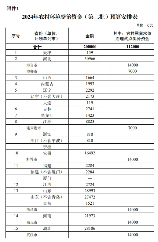 五、請認(rèn)真貫徹落實(shí)中央關(guān)于過渡期內(nèi)鞏固拓展脫貧攻堅(jiān)成果同鄉(xiāng)村振興有效銜接的要求,按照財(cái)政部等10部門《關(guān)于將脫貧縣涉農(nóng)資金統(tǒng)籌整合試點(diǎn)政策優(yōu)化調(diào)整至國家鄉(xiāng)村振興重點(diǎn)幫扶縣實(shí)施的通知》(財(cái)農(nóng)〔2024〕1號(hào))等有關(guān)規(guī)定,管好用好整治資金,加強(qiáng)對國家鄉(xiāng)村振興重點(diǎn)幫扶縣的支持力度。 六、為進(jìn)一步加強(qiáng)預(yù)算績效管理,請按照全面實(shí)施預(yù)算績效管理的要求,完善績效目標(biāo)管理,做好績效監(jiān)控和績效評(píng)價(jià),確保財(cái)政資金安全有效。同時(shí),將你省績效目標(biāo)及時(shí)對下分解,分解下達(dá)績效目標(biāo)要同時(shí)抄送財(cái)政部有關(guān)監(jiān)管局。 1.2024年農(nóng)村環(huán)境整治資金(第二批)預(yù)算安排表